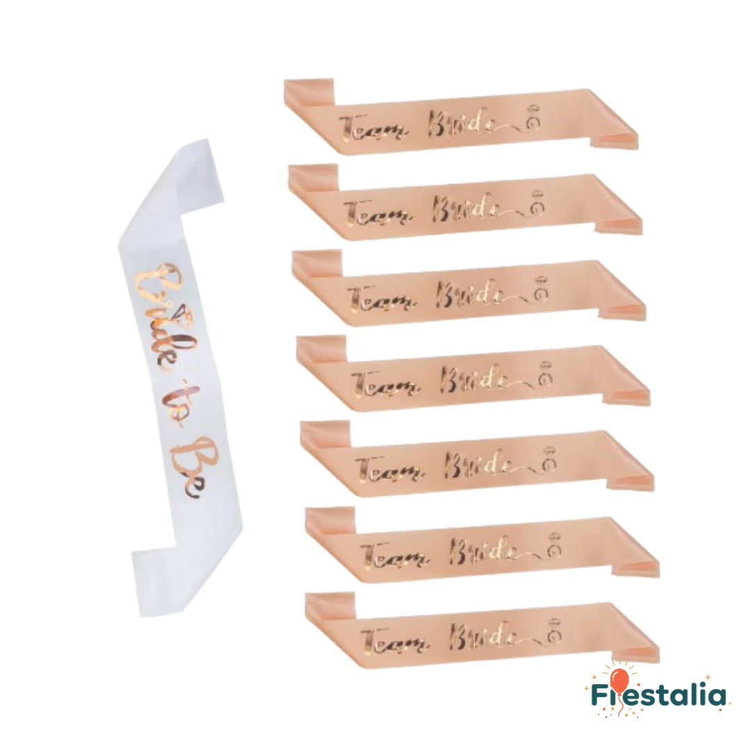 - Incluye la banda especial "Bride to Be" y varias "Team Bride" para que todas luzcan coordinadas.