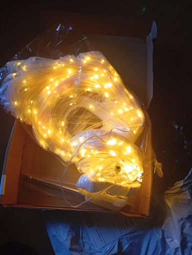 La capa blanca y azul con LEDs blancos es realmente preciosa. Los postes que vienen con ella para sujetarla son muy prácticos.