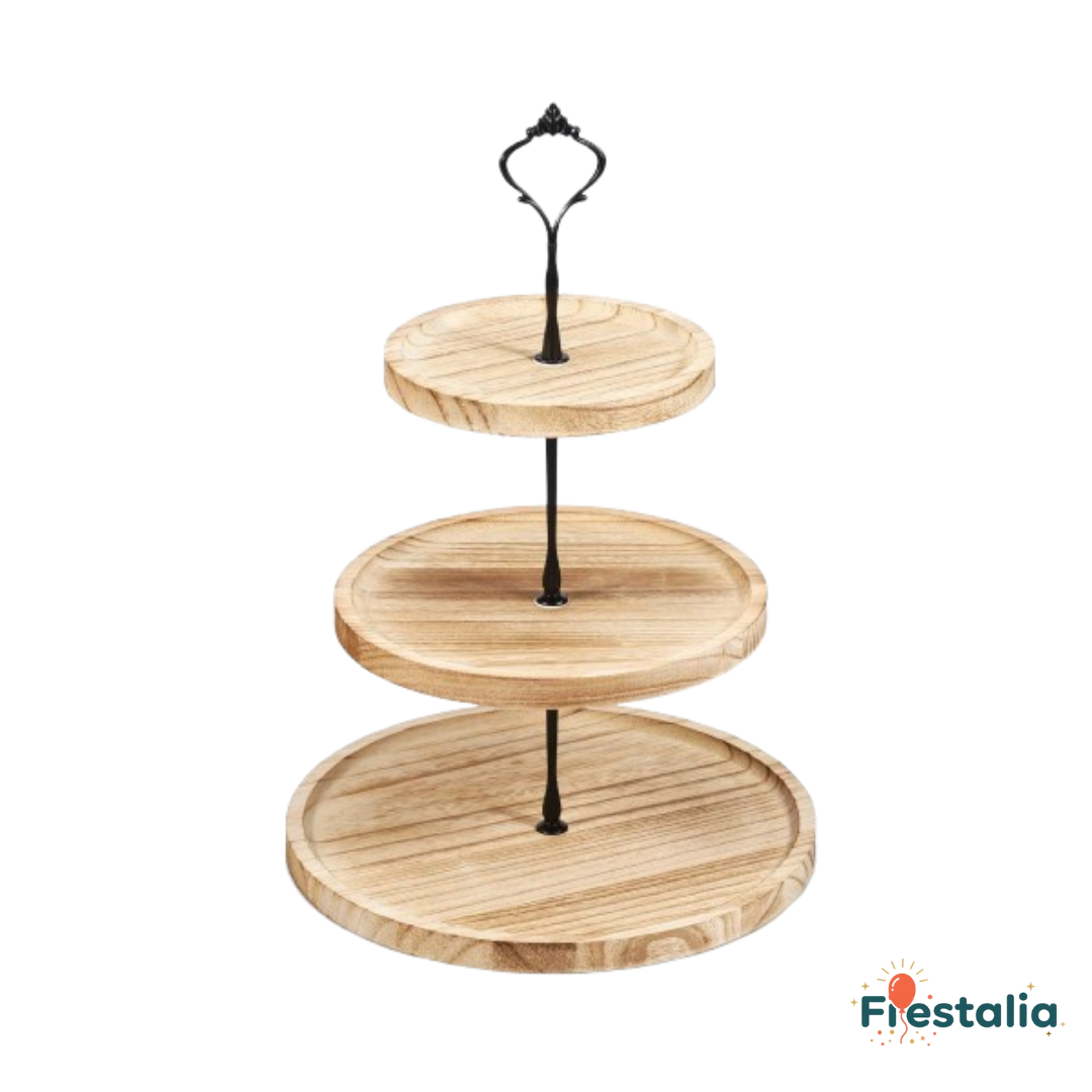 - 3 niveles amplios (25 cm, 20 cm y 15 cm de diámetro) para organizar cupcakes, frutas, postres o aperitivos.